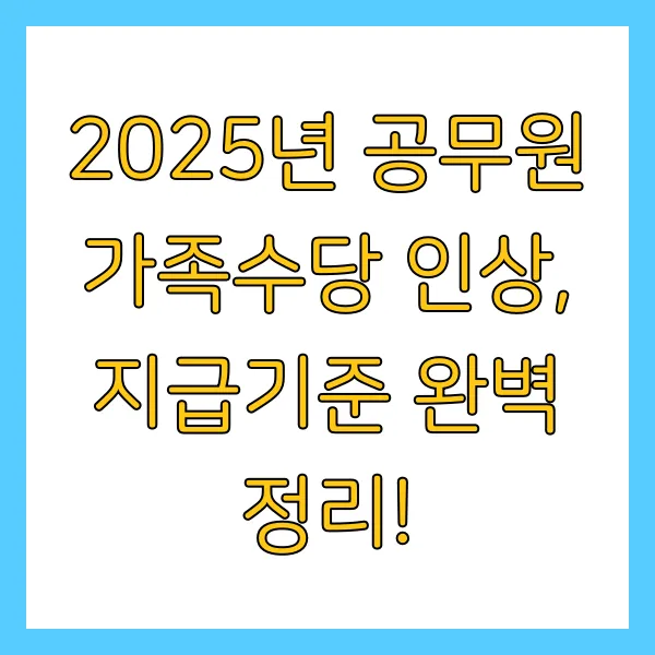 2025년 공무원 가족수당 인상! 공무원 여러분과 가족분들께 힘이 되는 소식이었기를 바랍니다. 앞으로도 공무원들의 복지 향상을 위해 더욱 노력하는 정부가 되겠습니다! 궁금한 점이 있다면 언제든 소속 기관에 문의하세요! 항상 응원합니다! 🥰 더 궁금한 사항은 인사혁신처( mpm.go.kr ) 또는 소속기관 인사부서에 문의하시면 친절하게 안내받으실 수 있어요.